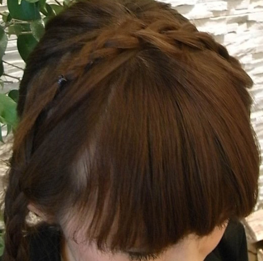 把耳朵两边泛起麻花辫之后的头发拿整理一下涌卡子扎好